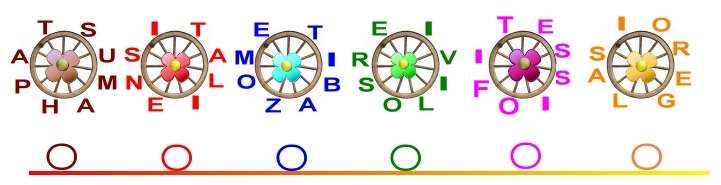 sous chacune des roues , en plaçant l'initiale dans les cercles colorés .