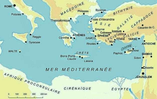 Tu peux copier et imprimer cette carte et t'amuser � tracer tous les chemins o� Paul a enseign� l'�vangile - - Paul est alors devenu ap�tre de J�sus, missionnaire � Il a �t� le t�moin du Christ tout autour de la M�diterran�e - Antioche- Salamine-Paphos- Attalia- Iconium- Lystre . - Antioche-Tarse- Lystre- Iconium- Colosses-Troas d�Alexandrie- Philippes- Thessalonique- Athenes- Corinthe- Ephese- C�sar�e-J�rusalem - J�rusalem- C�sar�e- Sidon - Myre - Rhodes- Lasa�a- Malte -Syracuse -Reggio - Potioles �Rome.