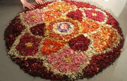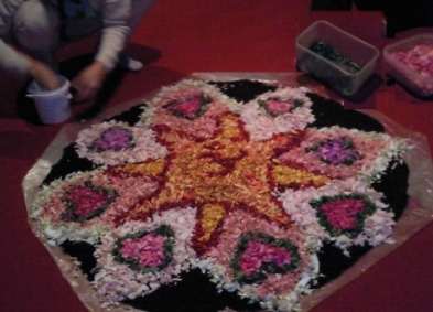 g�om�trique ; Pour le faire , il faut tout plein de fleurs de coloris diff�rents , du temps et de la patience . Alexandra avec ses enfants en ont r�alis�s plusieurs . Une fleuriste a toujours des fleurs en fin de vie ... il suffit donc de les lui demander ! Les p�tales des fleurs sont ensuite arrach�es et decoup�es puis entrepos�es suivant leur couleur dans des boites .