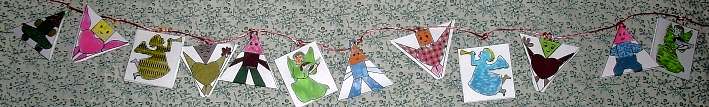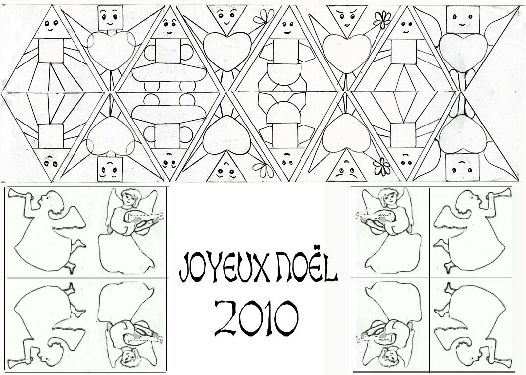 Les 12 vignettes sont réunies sur une page de format A4 . Je te conseille d'imprimer cette page sur du papier blanc un peu épais ... Chaque vignette comporte 2 faces qui se situent une sous l'autre . Il faut ensuite colorier l'image et son double au dessous , et la découper puis la plier pour obtenir un triangle pour les personnages ou un rectangle pour les anges . Tu imprimeras 2 planches de vignettes afin de posséder 24 éléments.